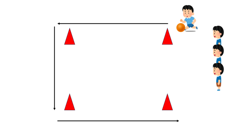 狭い空間でやるなら四角形にコーンを置いて、周りを走る。