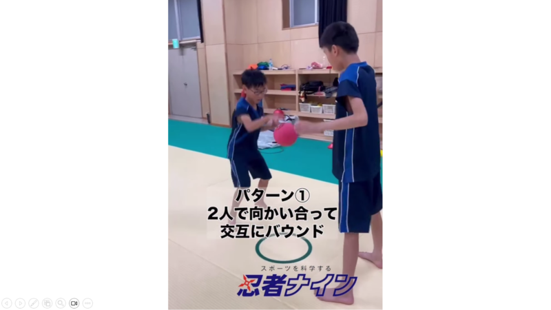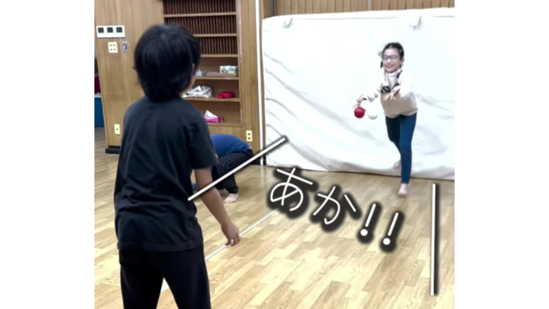 ・一斉に上に投げ、先生の指示したところをタッチしてからキャッチ