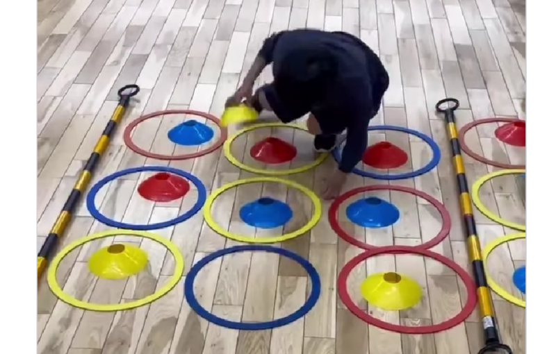 スタート位置のコーンからトランプゾーンに走っていき、トランプを1から順にめくり、全てめくれたらOK。