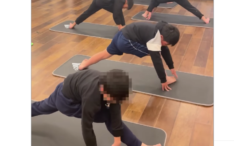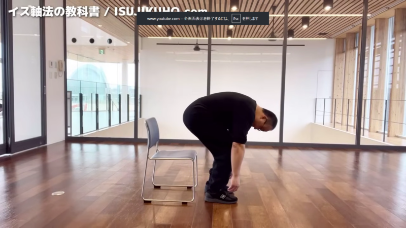 足を大きく開いて、両手をつきながら、体を大きくねじる