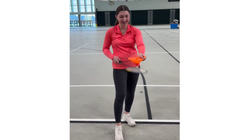 バドミントンラケットでコーンをタッチ