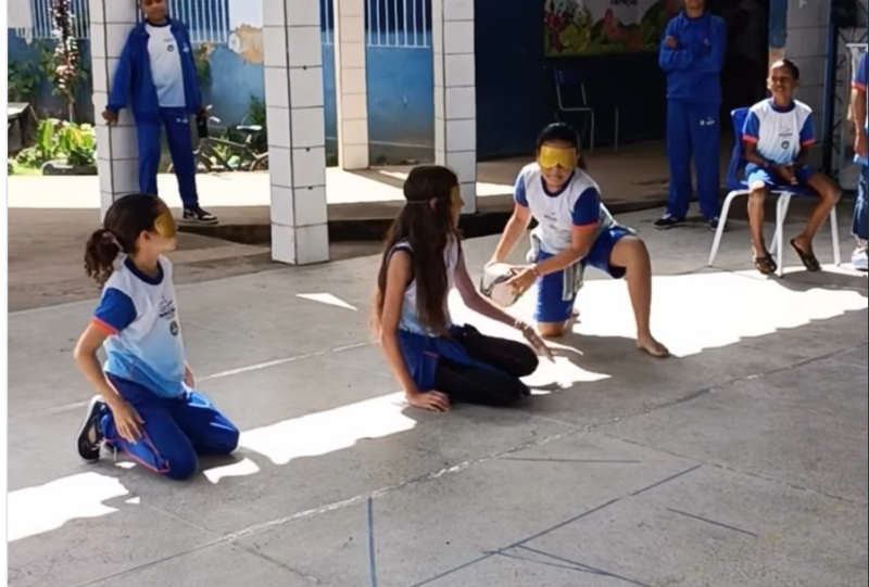 目隠しして、音のなるボールを投げる。